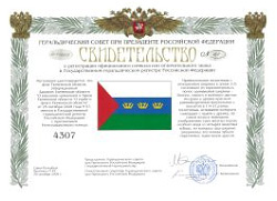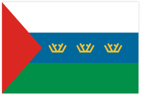 - прямоугольное полотнище с отношением ширины к длине 2:3, состоящее из горизонтальных полос одинаковой ширины - белого, синего и зеленого цветов, несущее у древка красный равнобедренный треугольник с высотой в 1/4 от длины полотнища, основание которого совпадает с краем у древка; на синей полосе помещено изображение трех желтых корон особого вида (о четырех видимых зубцах, из которых два средние раздвоены; все концы зубцов скруглены), одна подле другой.